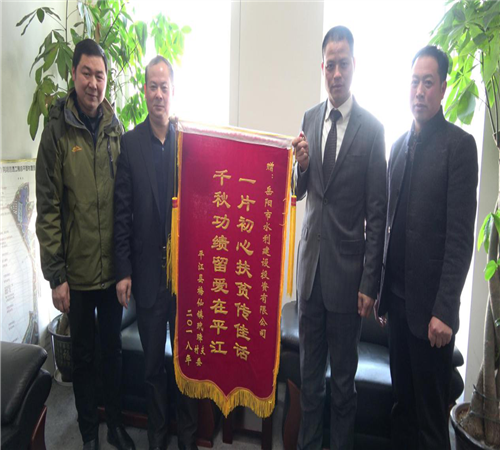 1月22日,平江县梅仙镇玳璋村帮扶对象,将一面写着"一片初心扶贫传佳话,千秋功绩留爱在平江"18个大字的鲜红锦旗送到市水建投董事长刘宝山、总经理杨雄辉的手中,对市水建投对精准扶贫工作的大力支持表达诚挚谢意。